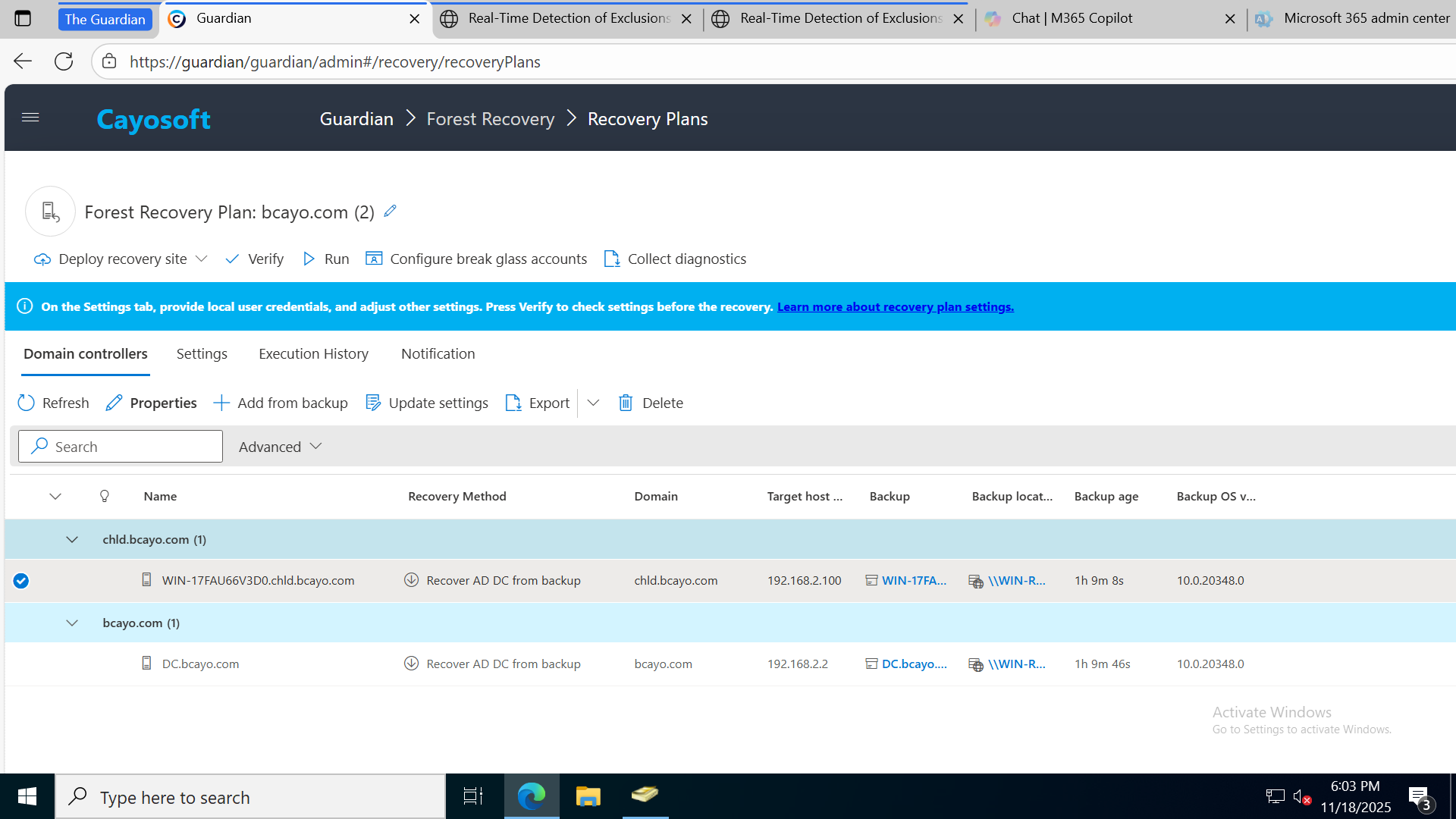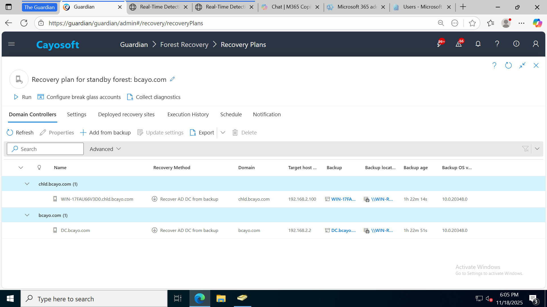 Cayosoft Guardian can address these test cases by eliminating the manual processes traditionally associated with backup, restore, and testing. Guardian seamlessly automates these critical tasks, operating on a scheduled basis and can recover domain controllers, domains, forests, containers, and organizational units (OUs) much more quickly than native Active Directory tools. It’s very easy, lightweight and unique approach to forest recovery ensures your Active Directory environment is always protected and ready for any contingency.