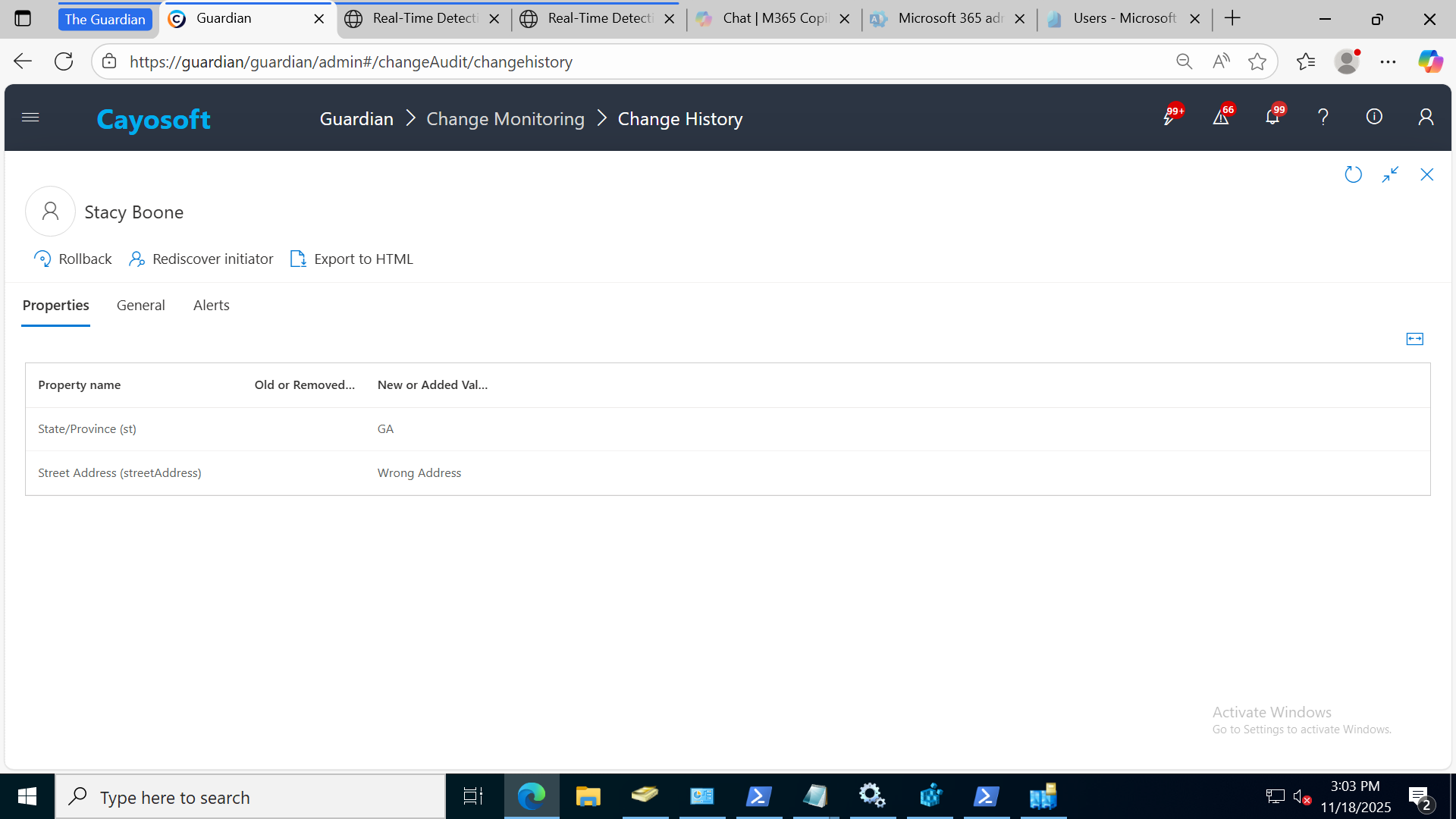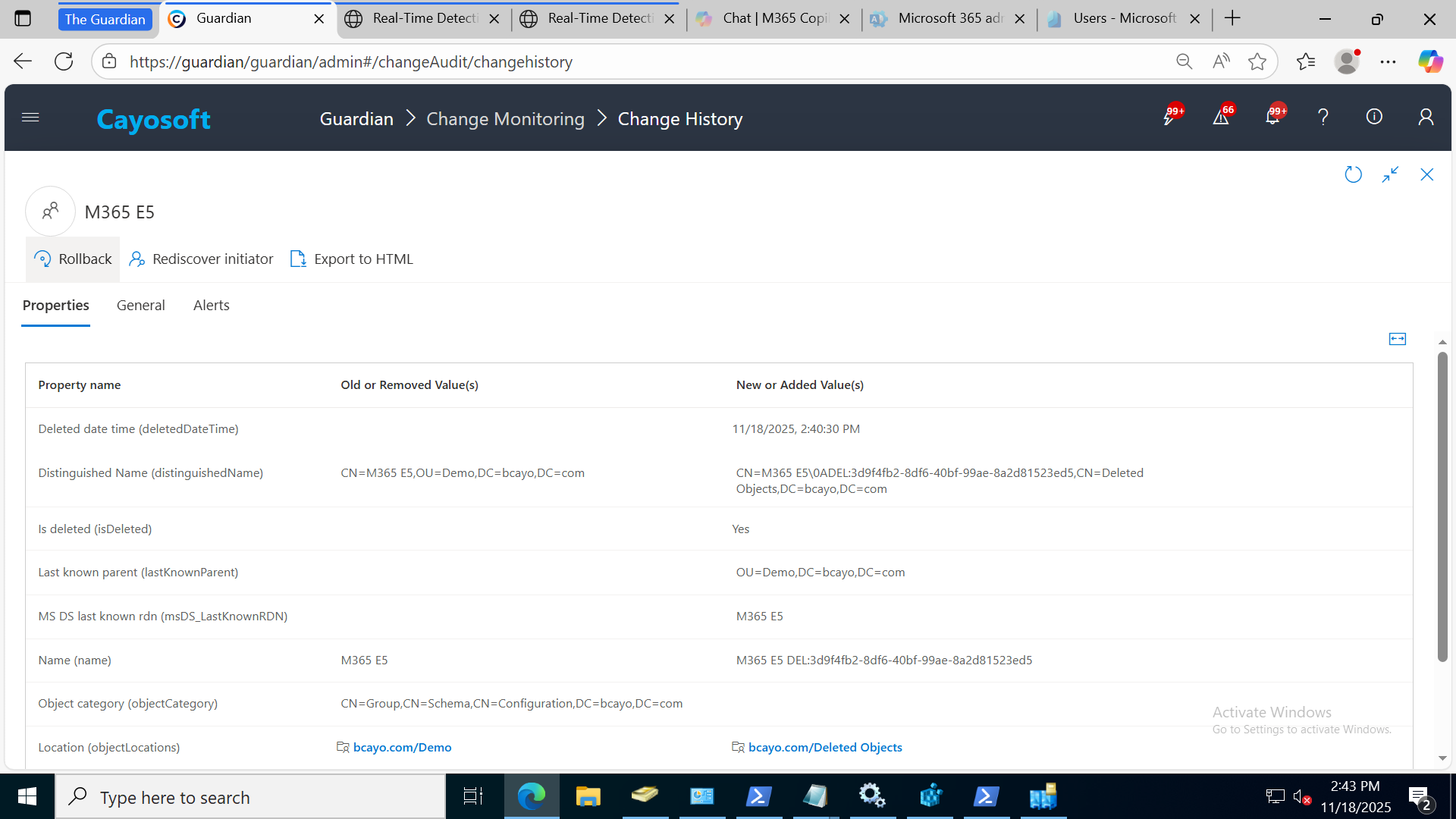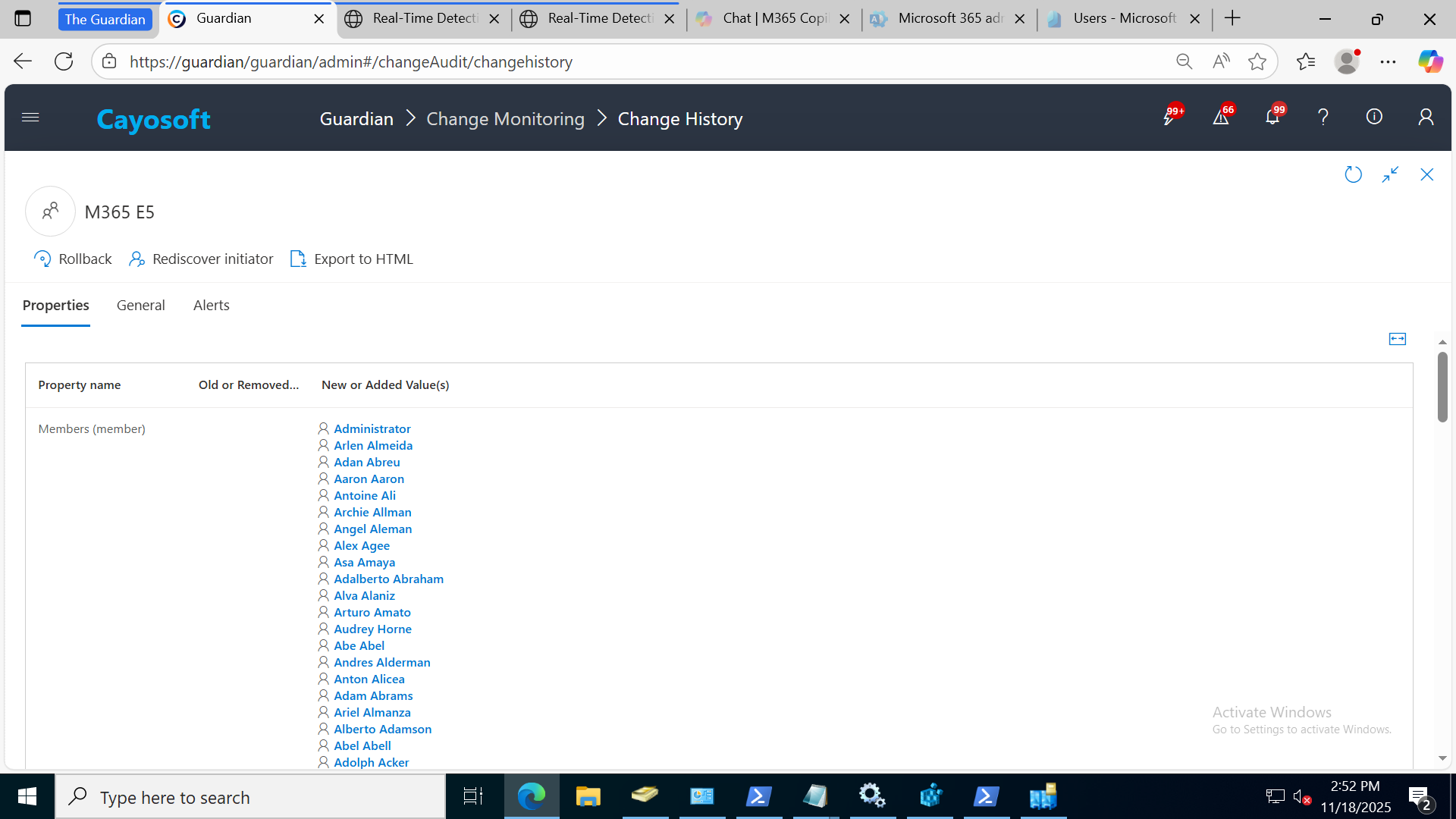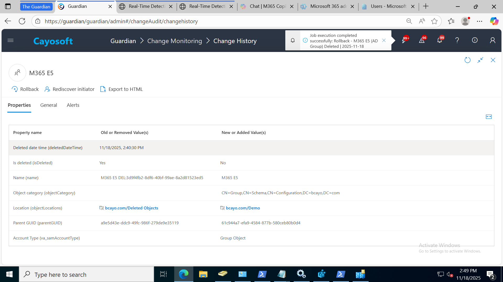 Cayosoft Guardian’s Change History view