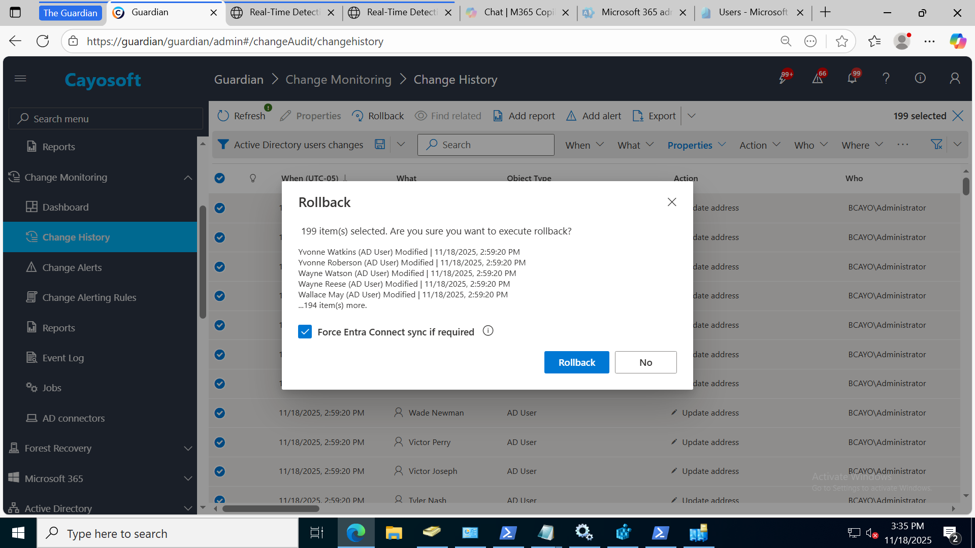 But Guardian goes beyond simple backups. It continuously monitors changes in your Active Directory and Entra ID (Azure AD), providing a detailed “Change History” view accessible through its web portal. As a result, administrators can pinpoint specific changes, review their impact, and quickly roll back any unwanted modifications with a single click.