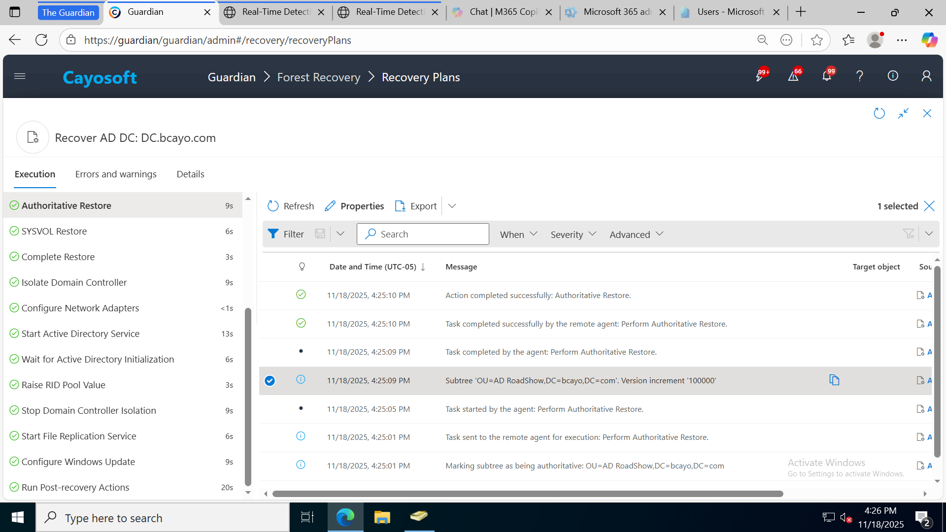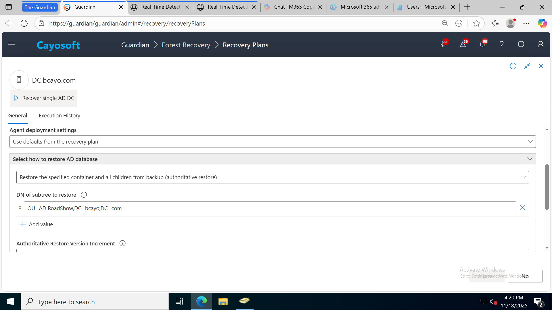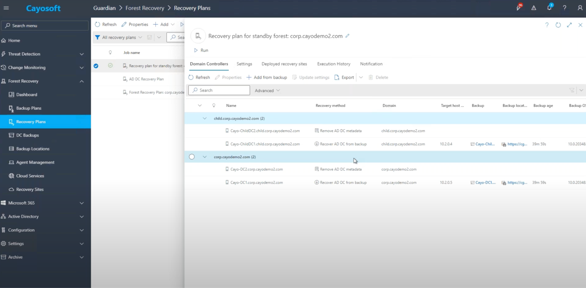 Cayosoft Guardian’s recovery plan view