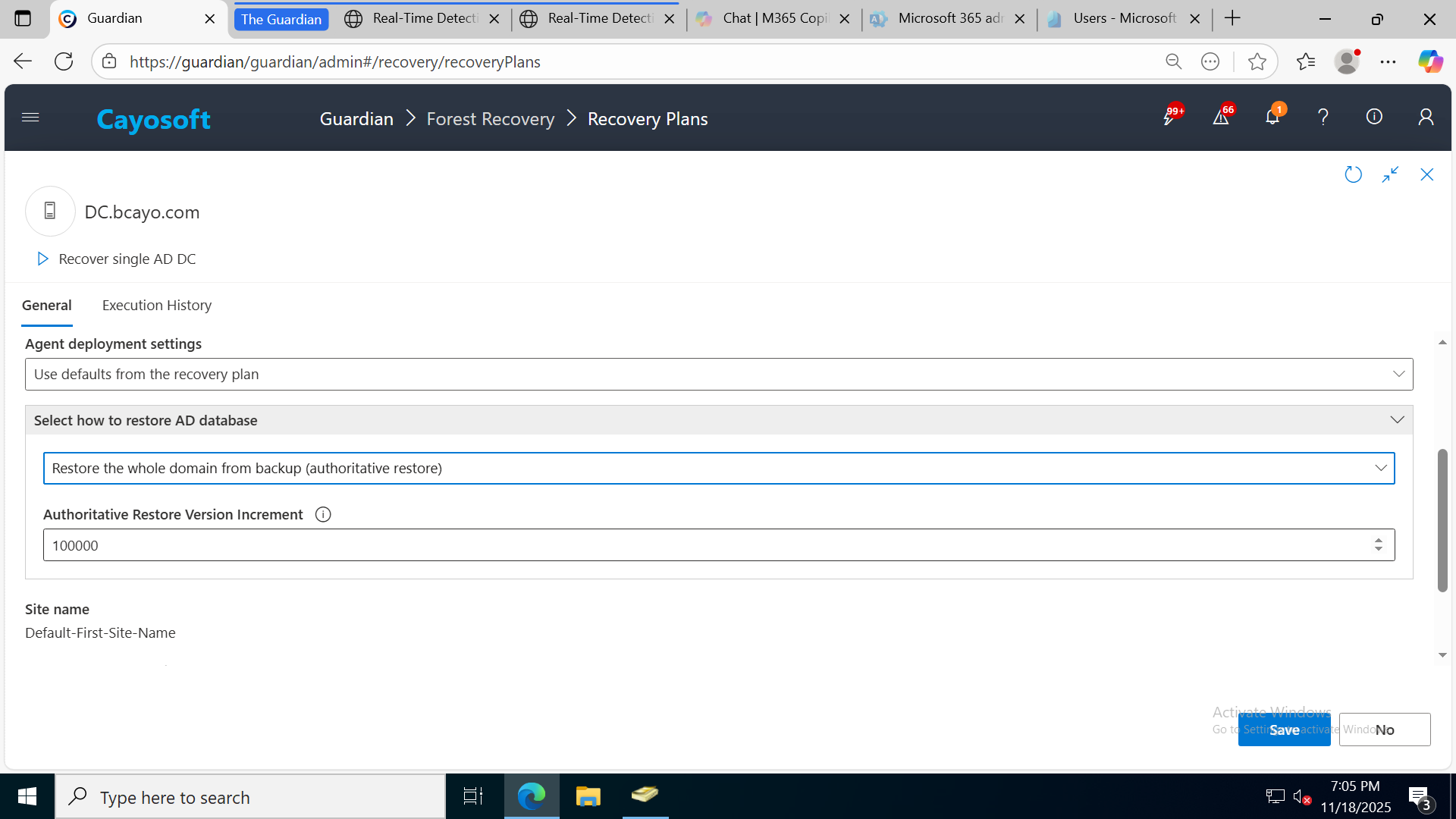 Guardian can validate the Active Directory disaster recovery plan by restoring a forest to a recovery site. Deploying the recovery site in Azure or AWS can allow Guardian to configure virtual machines automatically with the appropriate network and operating system settings for the recovery site network. This feature is known as Instant AD Forest Recovery.