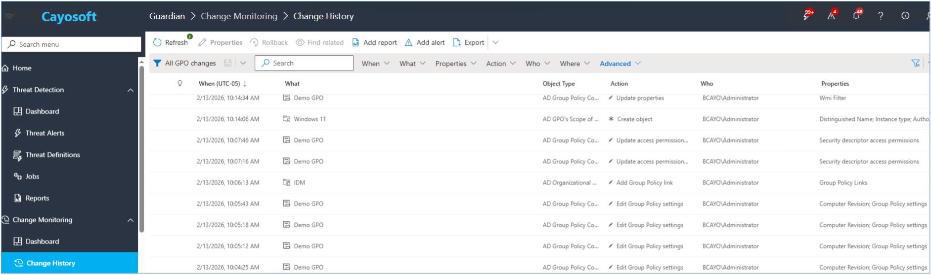 • Continuous Monitoring: Unlike AGPM, which relies on controlled workflows, Cayosoft provides continuous visibility into live GPO changes.