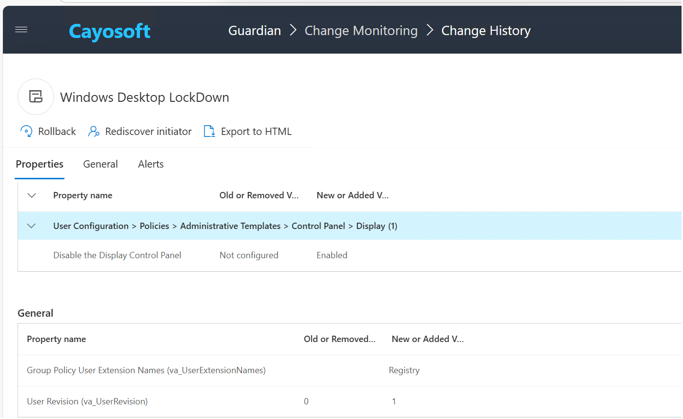 Guardian maintains change history that supports rollback and recovery scenarios. Administrators can respond quickly to configuration drift, mistakes, or malicious modifications without relying on unsupported tools.