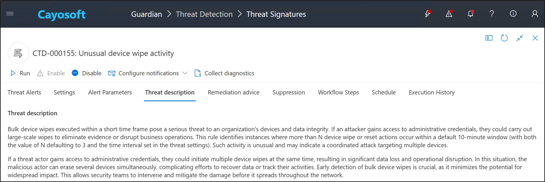 Cayosoft Guardian threat detection alerts of Intune bulk device and unusual wipe activities.
