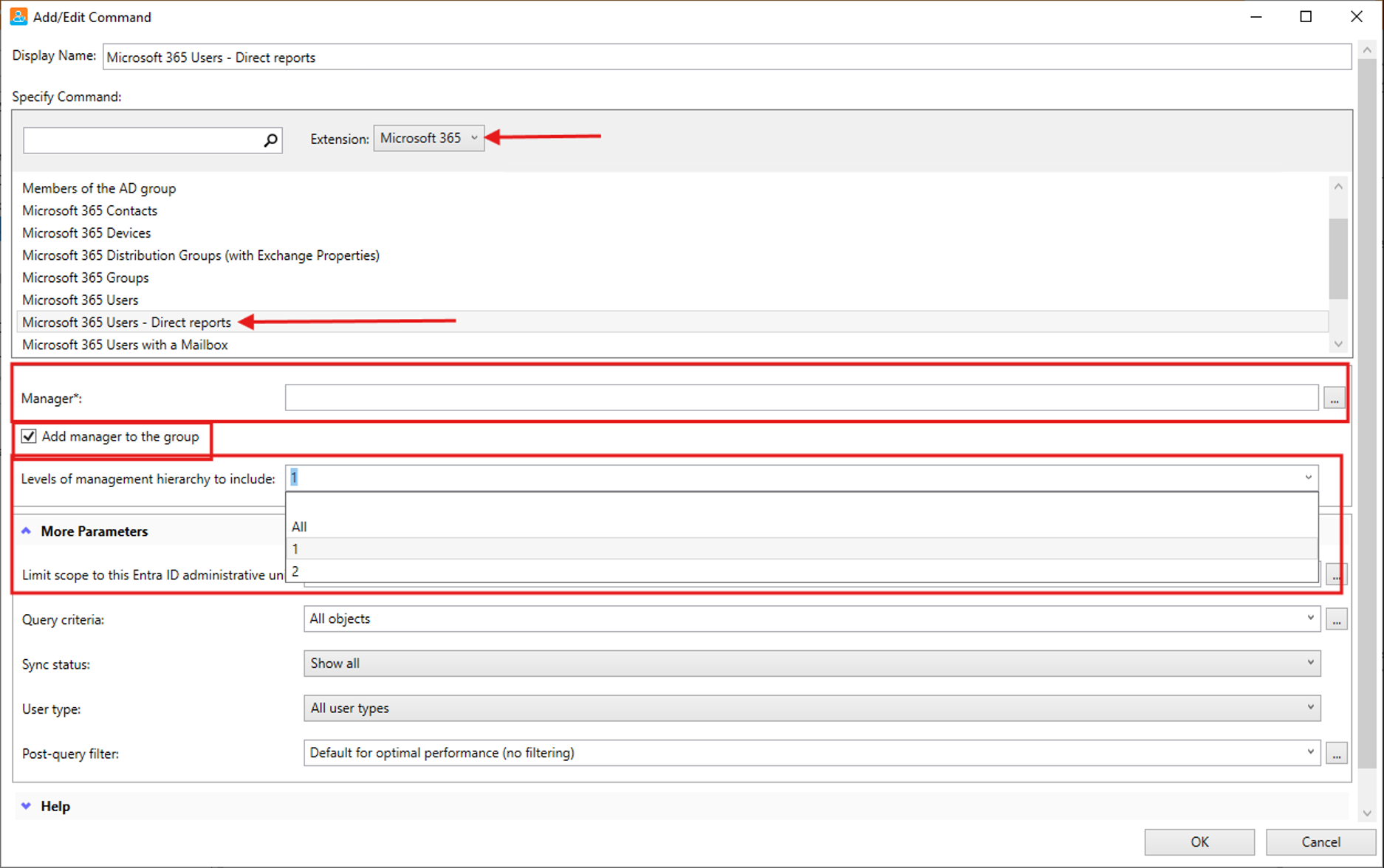 This is where Cayosoft Administrator’s Dynamic Group rule helps. You can use the Microsoft 365 Users – Direct Reports membership rule, define the manager, control the levels of management hierarchy, and then narrow the result with Entra ID administrative unit scope, query criteria, and post‑query filters.