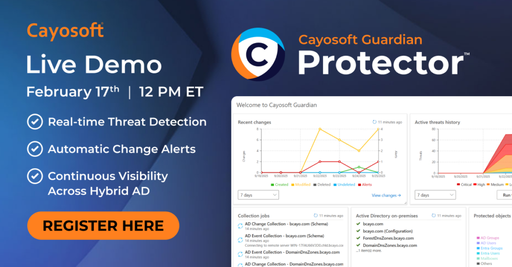 Join our 30-minute live demo and you’ll see how Cayosoft Guardian stops identity threats, tracks every change, and rolls back AD instantly, before issues become outages.