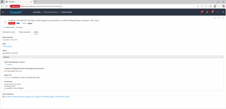 Cayosoft Guardian can proactively detect and alert on dangerous ACLs on DFSR settings objects. It continuously monitors Active Directory, Entra ID, Microsoft 365, and Intune for over 200 misconfigurations, providing early warning before attackers can exploit them.