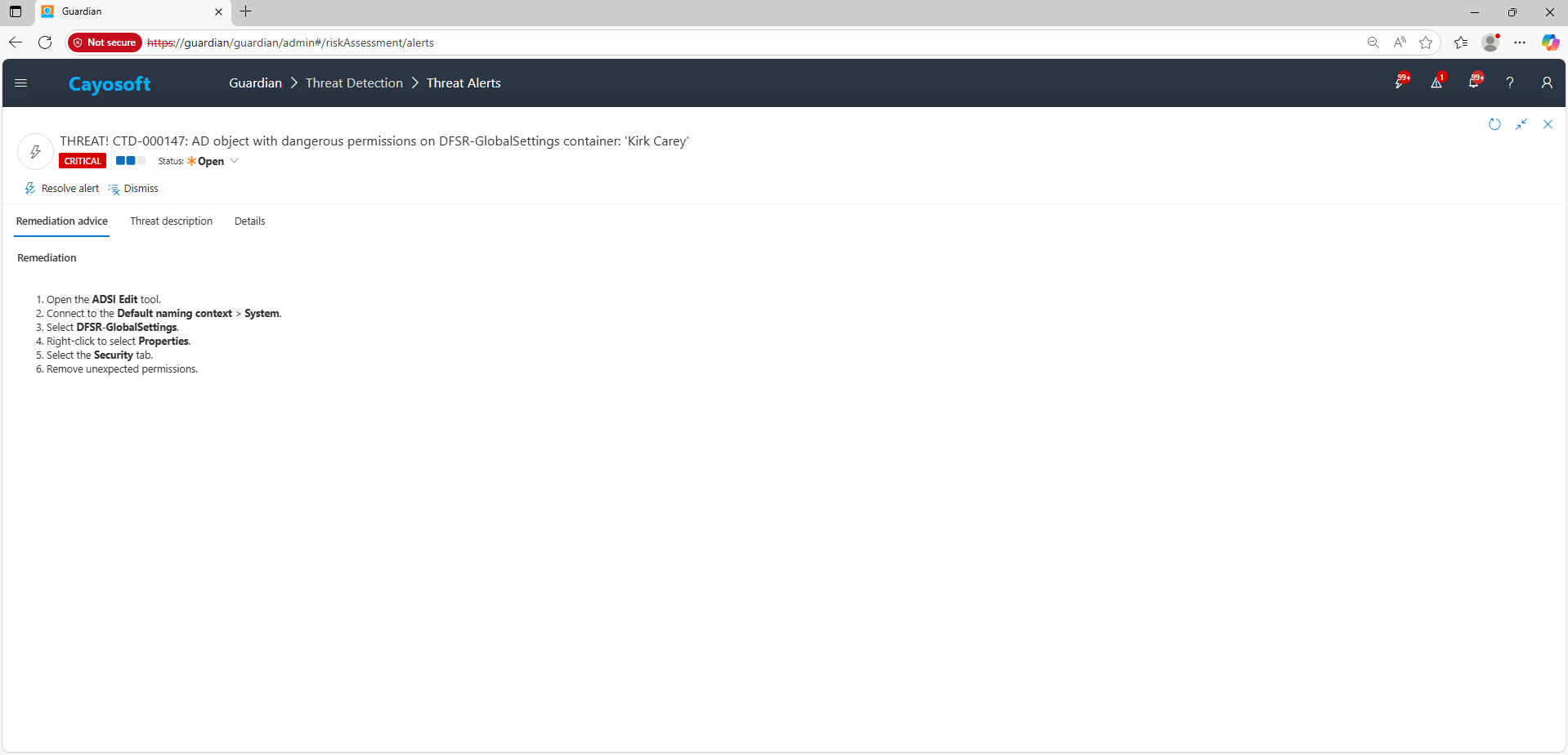 Using the remediation advice in Cayosoft Guardian, follow these steps to remove the vulnerability: