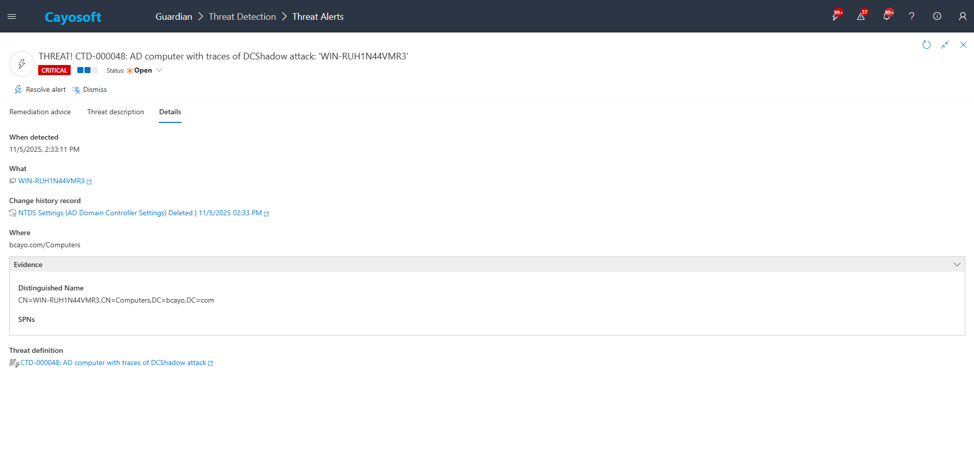 Cayosoft Guardian can proactively detect and alert on AD computers with DCShadow attack traces. It continuously monitors Active Directory, Entra ID, Microsoft 365, and Intune for malicious changes and indicators of compromise, giving you early warning before attackers can escalate privileges undetected.