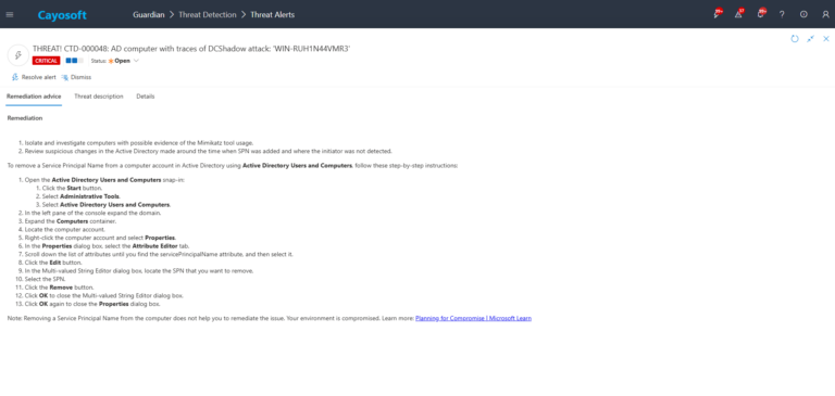 An attacker gains a foothold on a workstation in your network and deploys Mimikatz’s DCShadow feature. They register the compromised machine as a rogue domain controller, push unauthorized changes to privileged accounts, and hide their tracks by avoiding traditional event logs. The only clues are suspicious SPN values left on the computer account. Without timely detection, the attacker could maintain persistence and escalate privileges. Cayosoft Guardian identifies these traces in near real time, raising an alert even when the initiator is unknown.