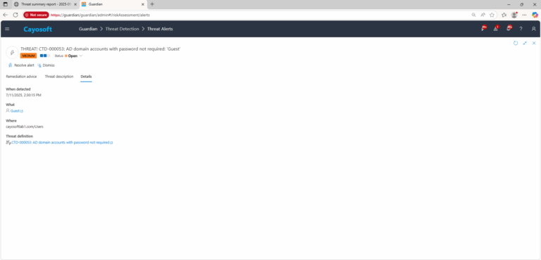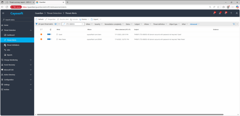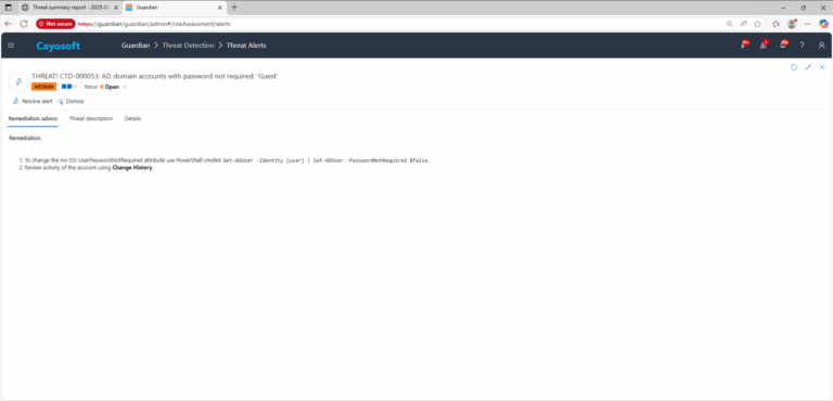 During an audit, a legacy import process accidentally sets Password not required on a batch of test users that were later granted file-share access. An attacker enumerates AD, finds the misconfigured accounts, and logs in with blank passwords to stage data theft and password-spray attempts from trusted endpoints. Cayosoft Guardian would detect CTD-000053 and list affected users so the team can immediately enforce password requirements and review any activity tied to these identities.