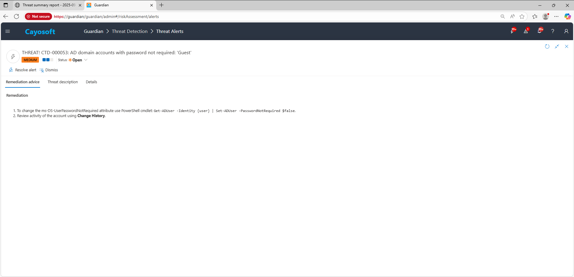 During an audit, a legacy import process accidentally sets Password not required on a batch of test users that were later granted file-share access. An attacker enumerates AD, finds the misconfigured accounts, and logs in with blank passwords to stage data theft and password-spray attempts from trusted endpoints. Cayosoft Guardian would detect CTD-000053 and list affected users so the team can immediately enforce password requirements and review any activity tied to these identities.