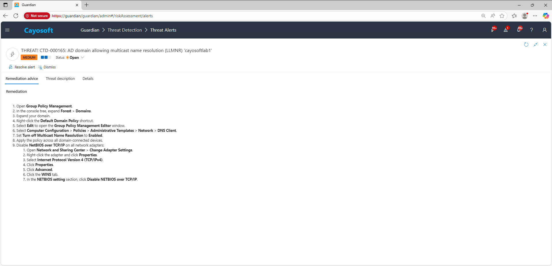 2.) Open All Alerts and search for CTD-000165 or AD domain allowing multicast name resolution (LLMNR).