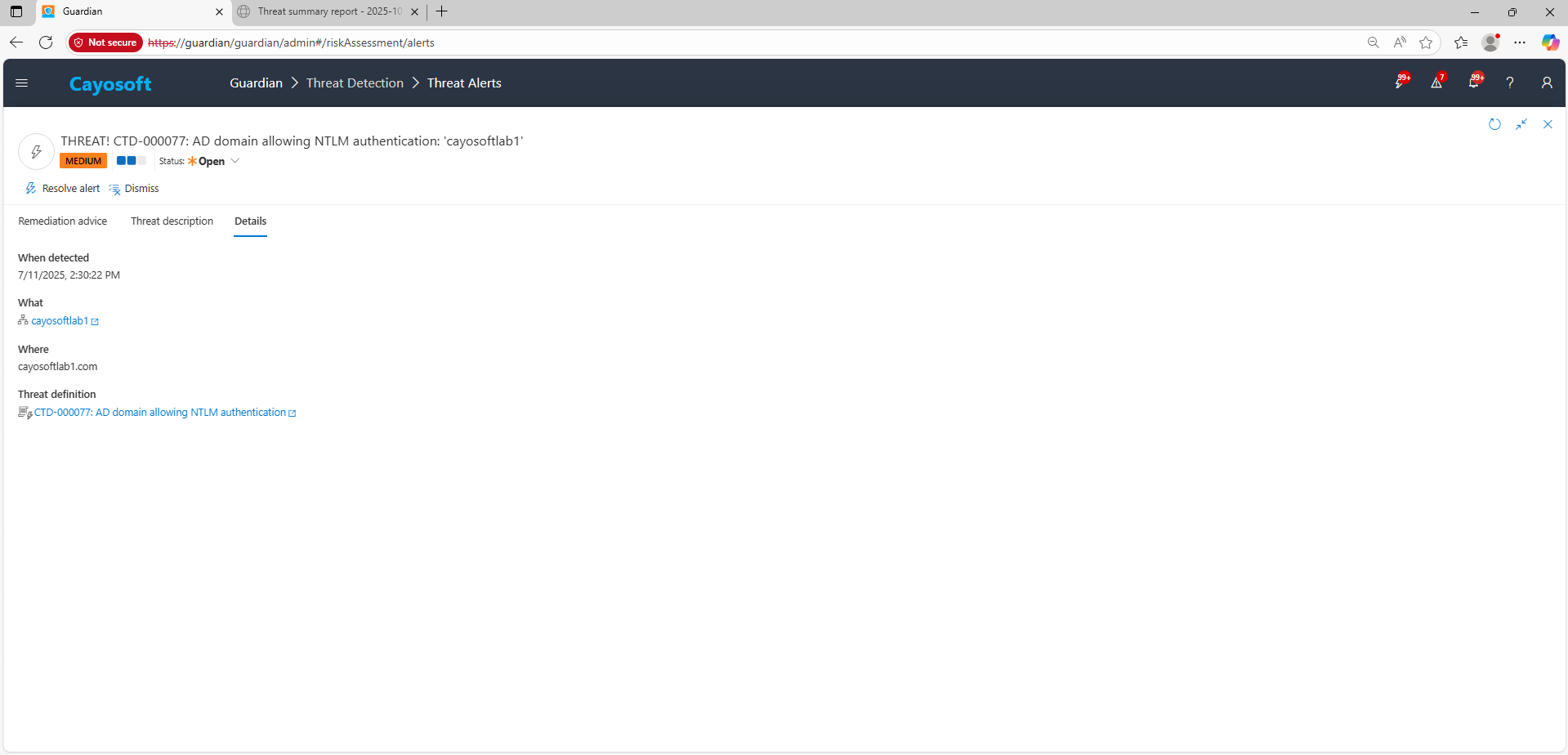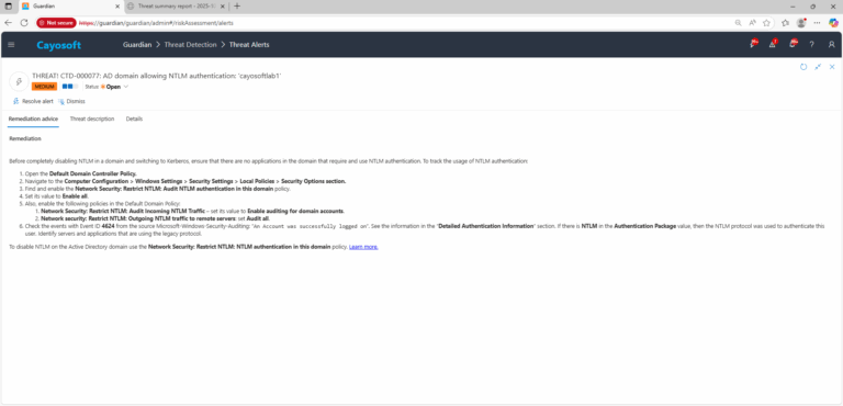 Administrators can sign in to the Cayosoft Guardian Threat Detection Dashboard, open All Alerts, and search for CTD-000077 or AD domain allowing NTLM authentication. The alert details identify which domains still permit NTLM, helping teams assess where legacy authentication is in use before implementing blocking policies.