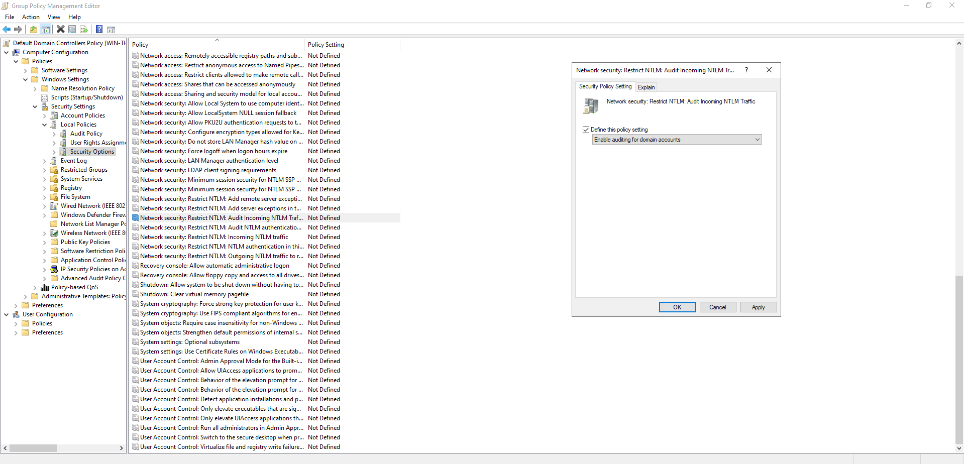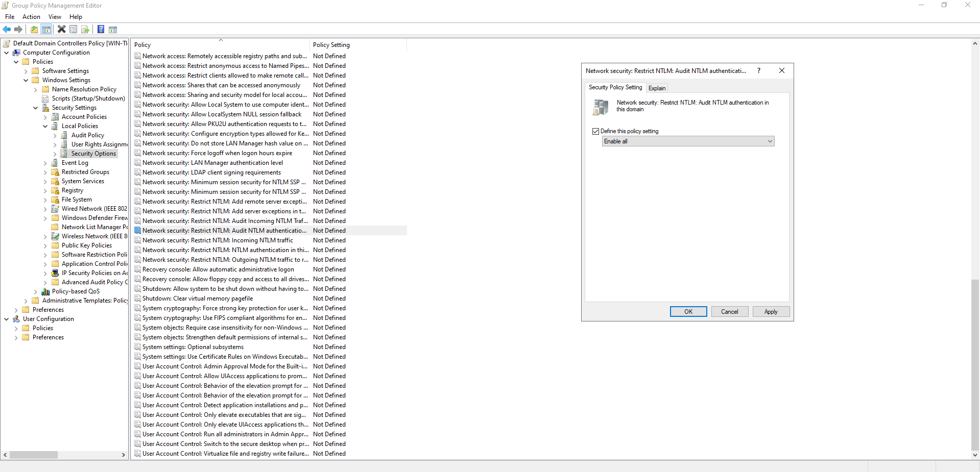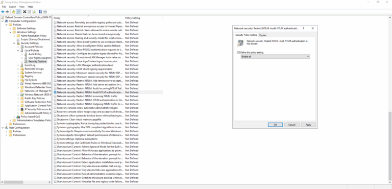- Find and enable the Network Security: Restrict NTLM: Audit NTLM authentication in this domain policy.