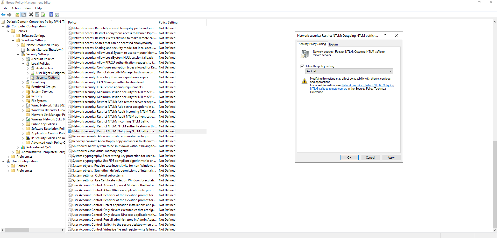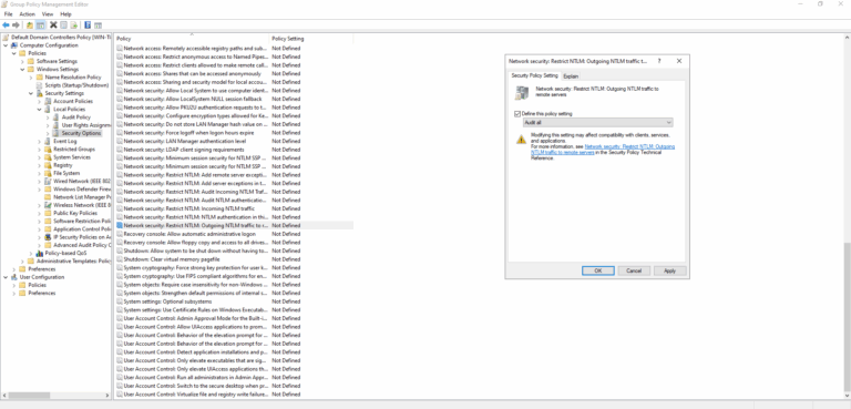- Network security: Restrict NTLM: Outgoing NTLM traffic to remote servers: set Audit all.