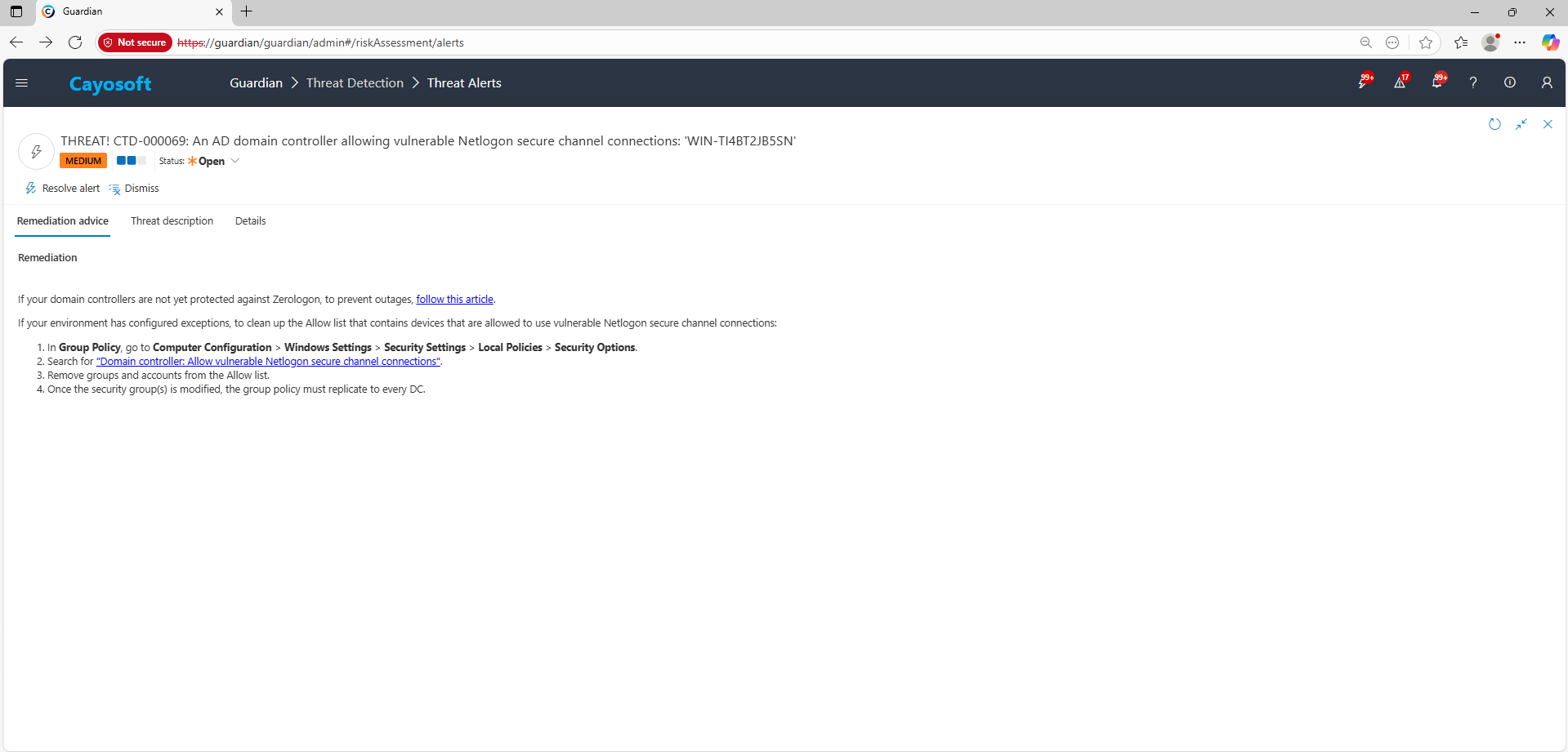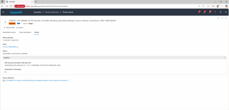 Cayosoft Guardian can proactively detect and alert on AD domain controller allowing vulnerable Netlogon secure channel connections. It continuously monitors Active Directory, Entra ID, Microsoft 365, and Intune for 200+ misconfigurations, providing early warning before attackers can exploit them.