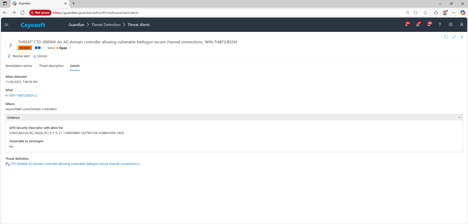 2.) Open All Alerts and search for CTD-000069 or AD domain controller allowing vulnerable Netlogon secure channel connections.