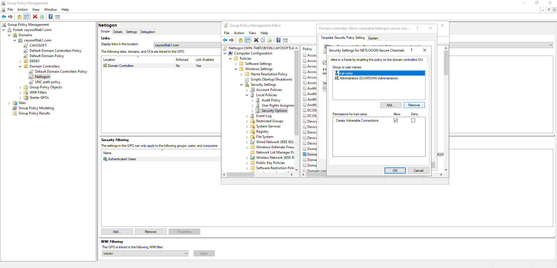 The Domain controller: Allow vulnerable Netlogon secure channel connections policy in Security Options manages exceptions and determines whether outdated or insecure clients can use the Netlogon secure channel.