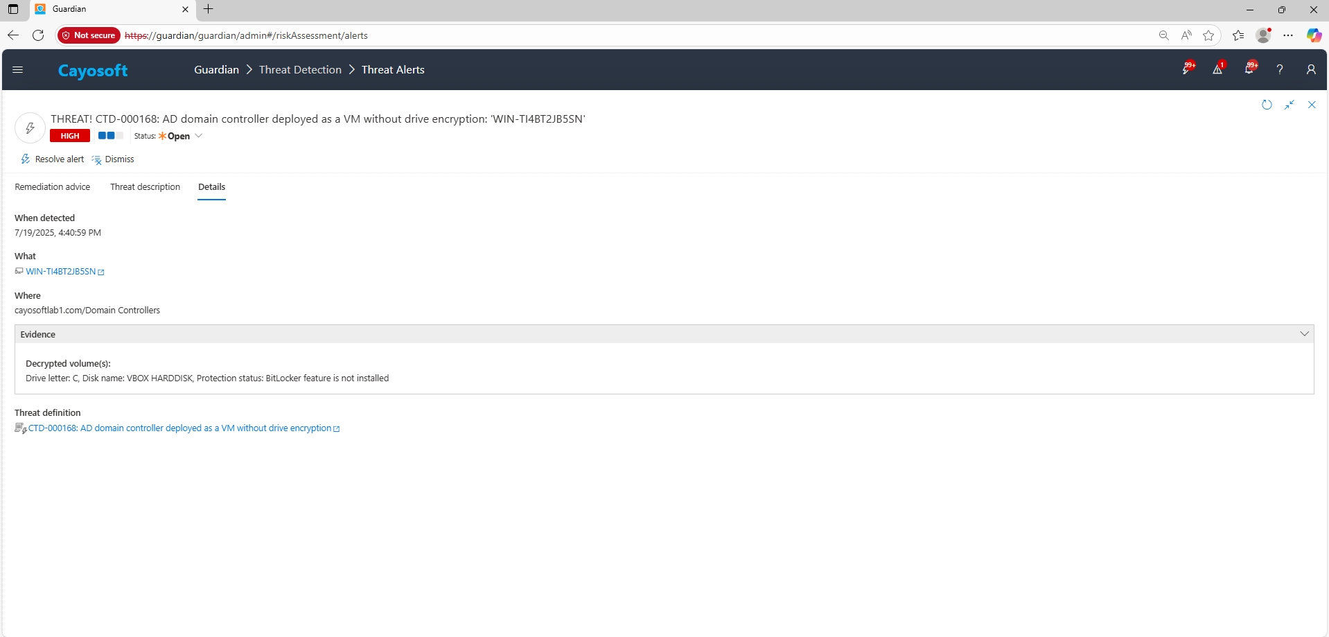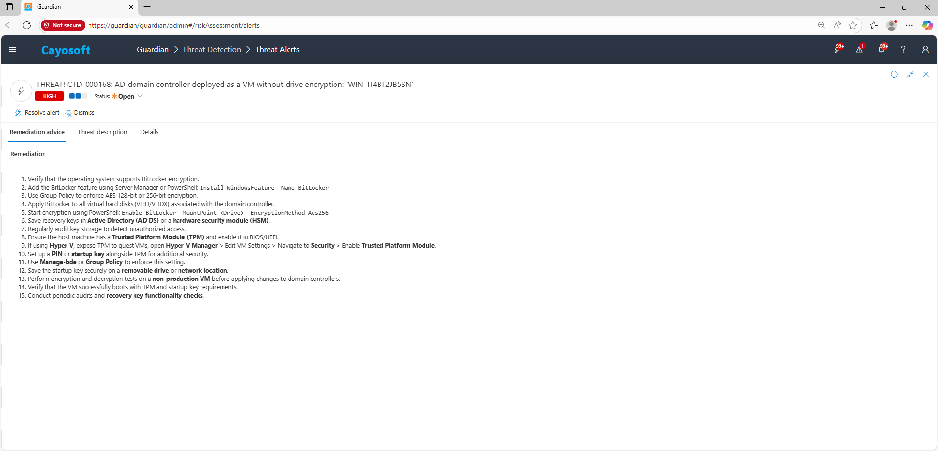Cayosoft Guardian can raise CTD-000168 alerts when a DC VM lacks encrypted volumes. In the dashboard, review alert details for “Decrypted volume(s)” evidence to confirm which drives are unprotected. Routine audits should also verify that BitLocker with TPM or vTPM is enabled on all domain controller VMs.
