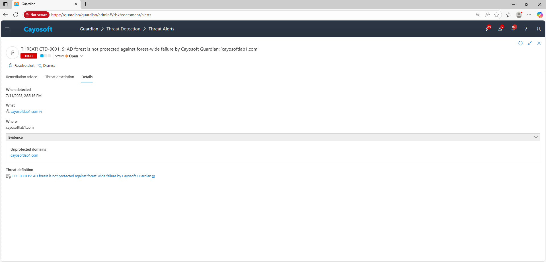 In the Cayosoft Guardian Threat Detection Dashboard, search for CTD-000119 alerts or view the Unprotected domains evidence. Then, in the Forest Protection / Backup Plan, ensure at least one domain controller per domain is listed as protected. Once coverage is confirmed, the status should show Healthy/Protected for all domains.