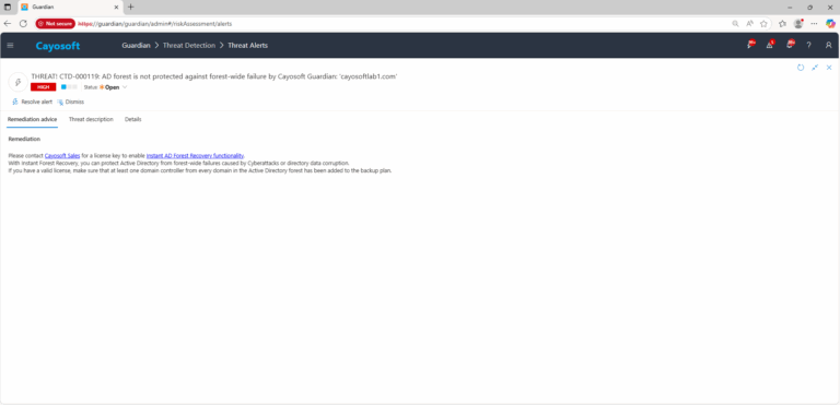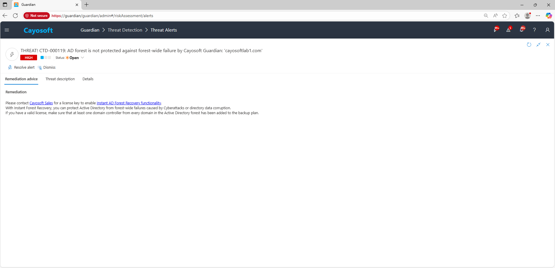 2.) Open All Alerts and search for CTD-000119 or AD forest is not protected against forest-wide failure by Cayosoft Guardian.