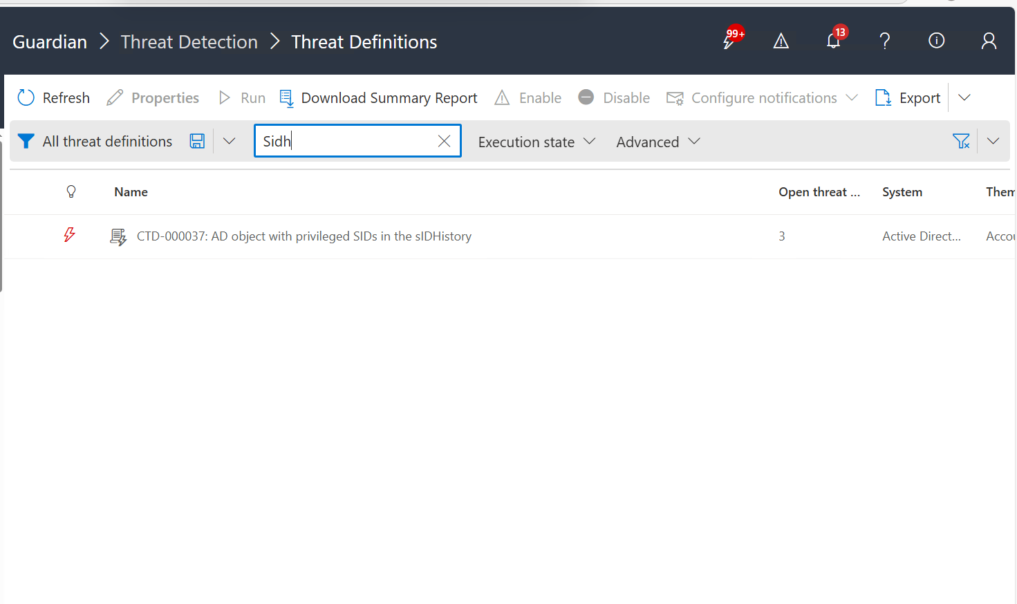 2.) View All Alerts and search for CTD-000037 or “AD object with privileged SIDs in the sIDHistory”.