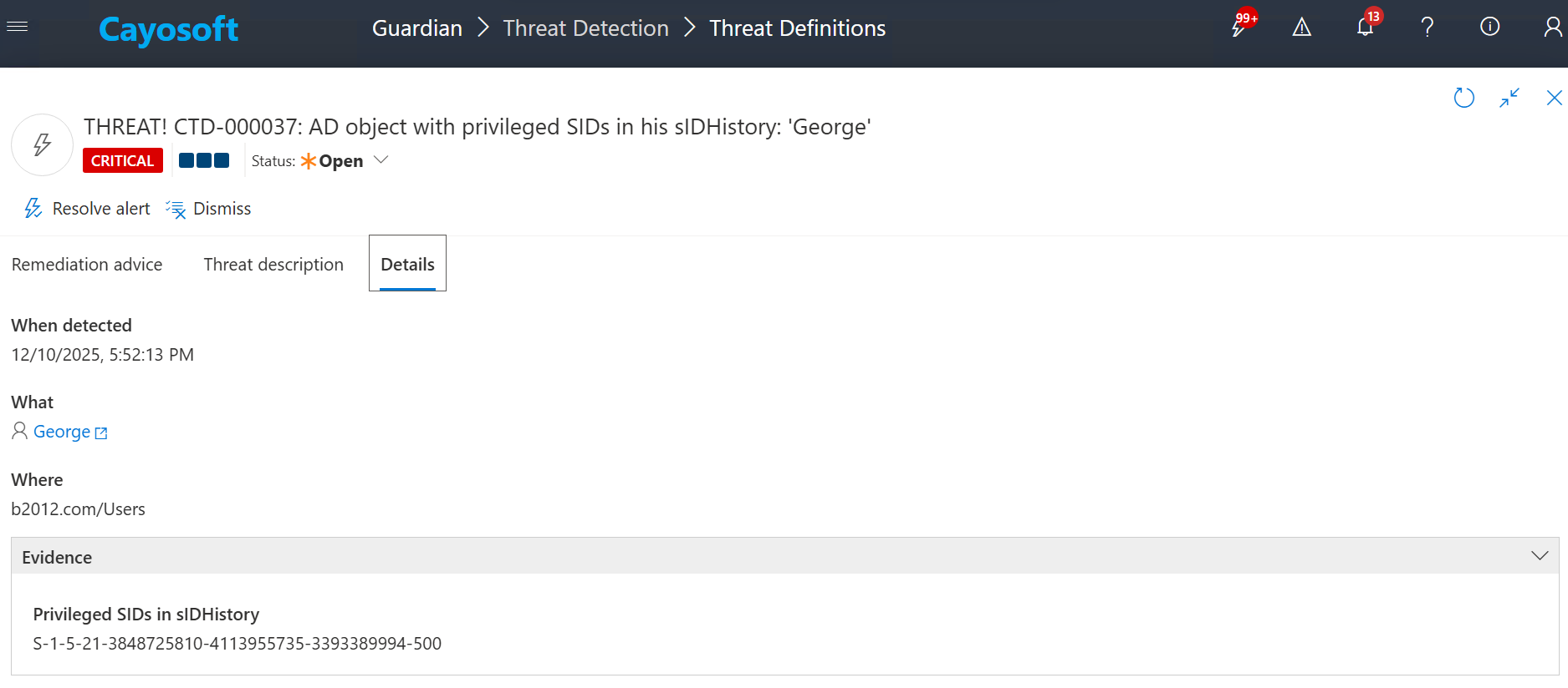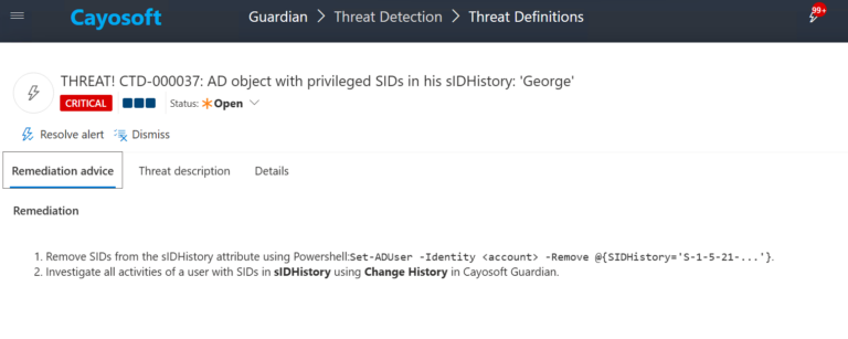Cayosoft Guardian would have detected the presence of privileged SIDs in the sIDHistory attribute, allowing security teams to investigate and remove the injected privileges before major damage occurred.