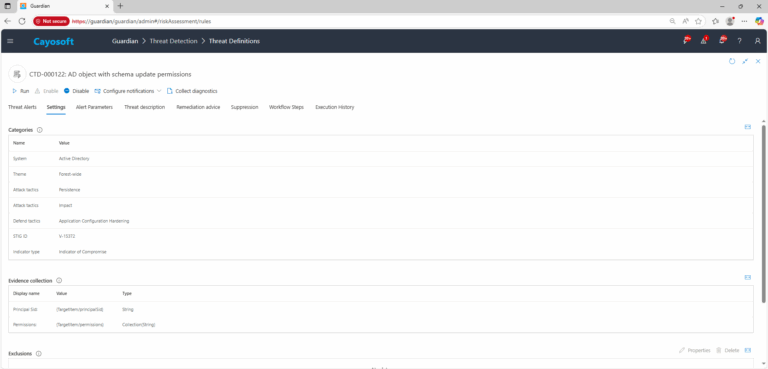 Cayosoft Guardian detects accounts with schema update permissions and raises an alert before such persistence mechanisms can be deployed.