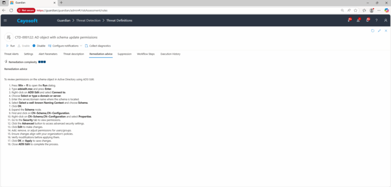 Cayosoft Guardian can proactively detect and alert on accounts with schema update permissions. Continuous monitoring of Active Directory security settings helps prevent persistence and destructive changes from being introduced into the forest.