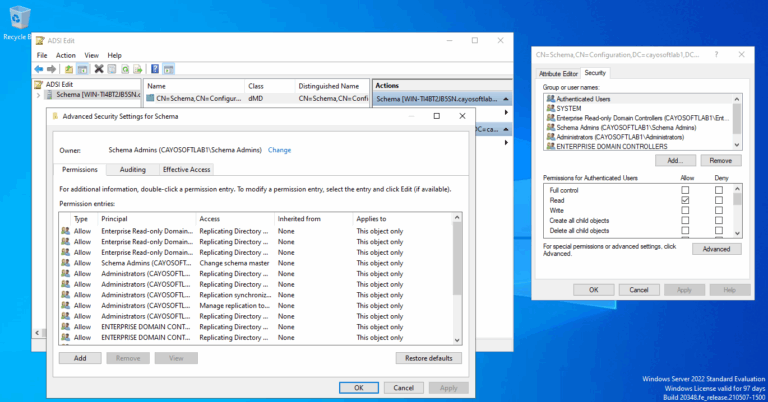 To review permissions on the schema object in Active Directory using ADSI Edit: