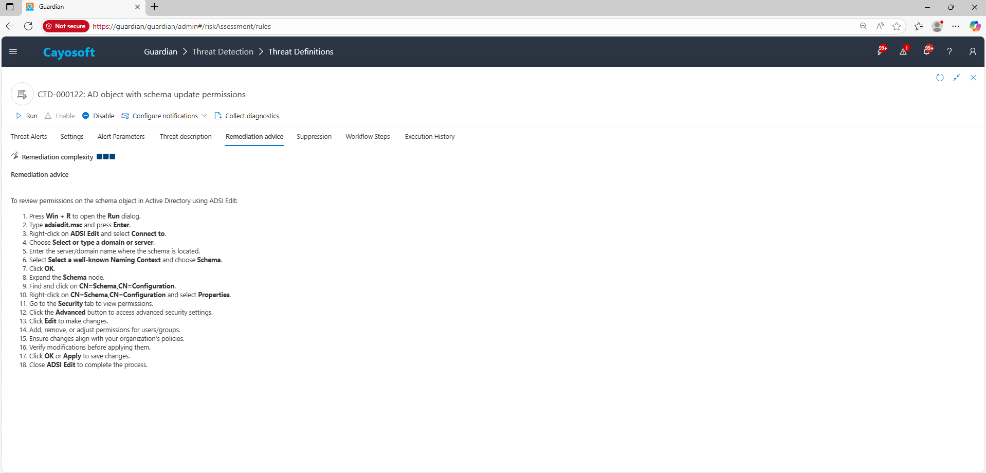Using the remediation advice in Cayosoft Guardian, follow these steps to remove the vulnerability: