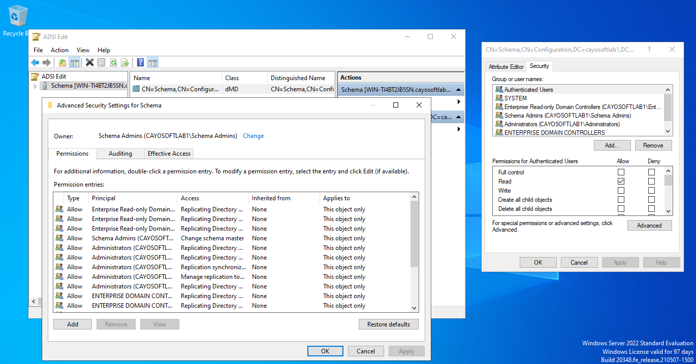 To review permissions on the schema object in Active Directory using ADSI Edit: