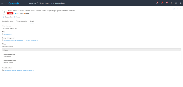 Cayosoft Guardian can proactively detect and alert on AD user added to privileged group. It continuously monitors Active Directory, Entra ID, Microsoft 365, and Intune for over 200 misconfigurations, providing early warning before attackers can exploit them.