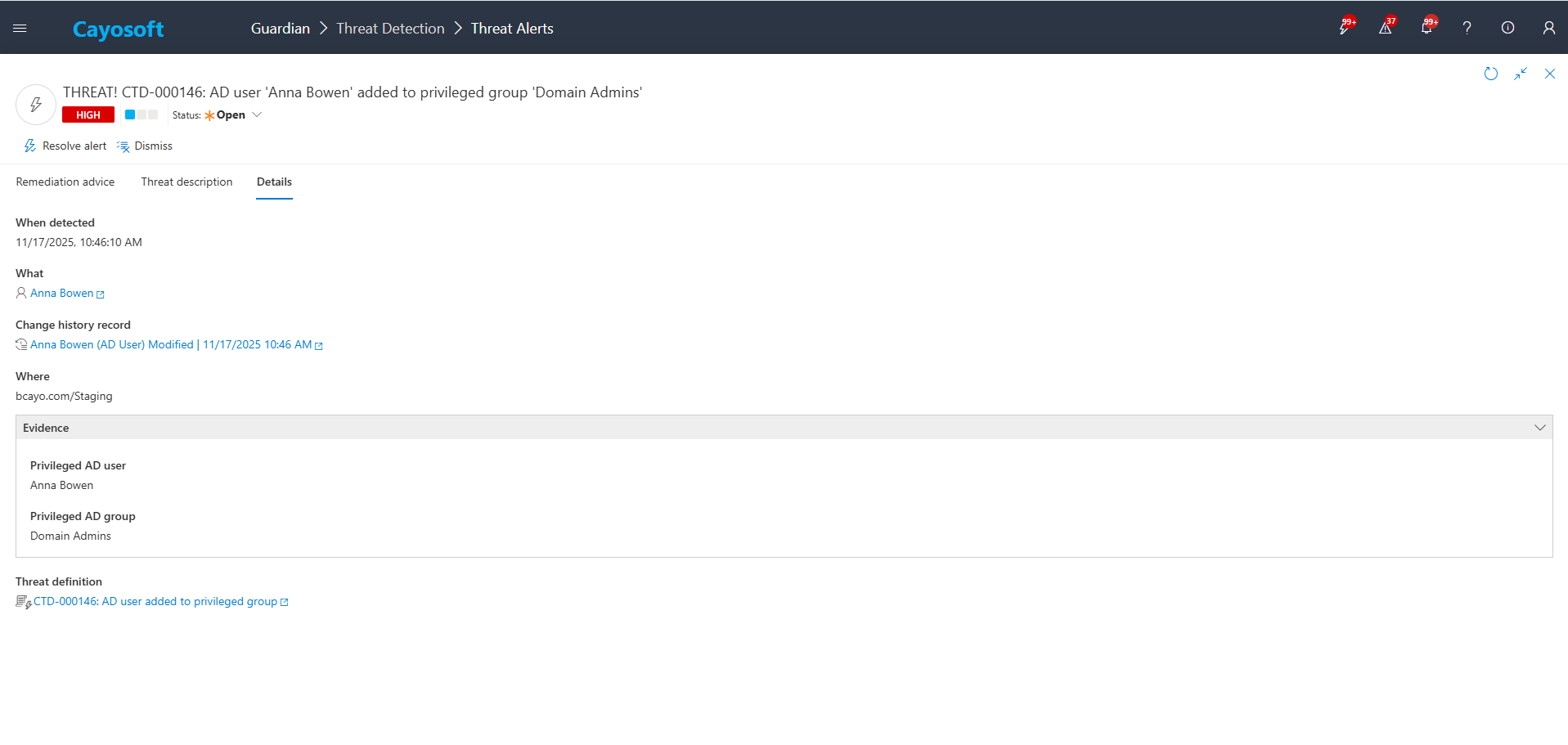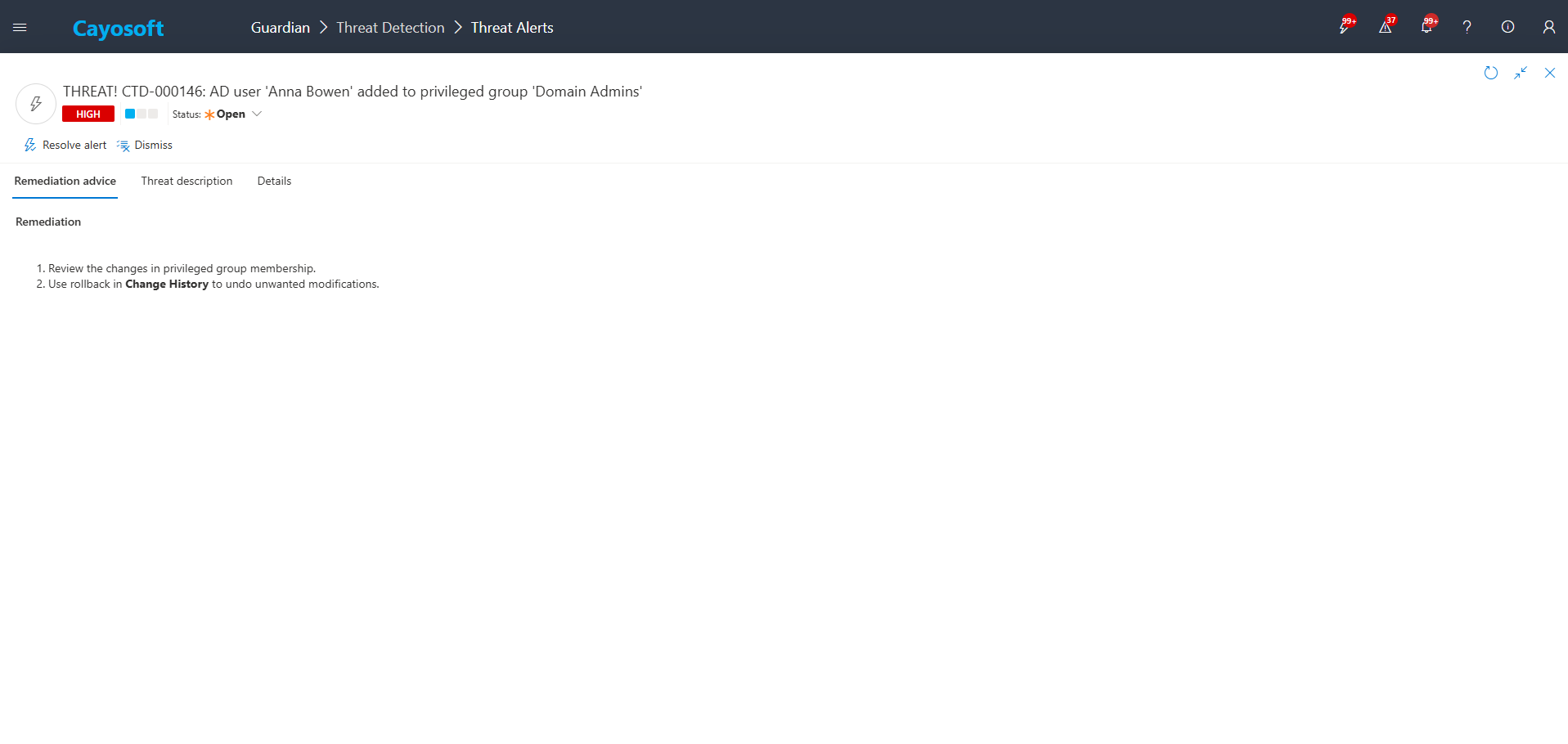 - Enable and keep CTD-000146 active in Cayosoft Guardian to continuously monitor and alert on additions to privileged groups (direct and nested).