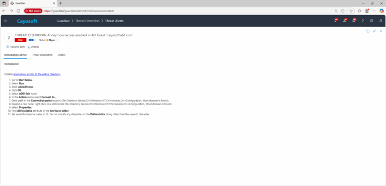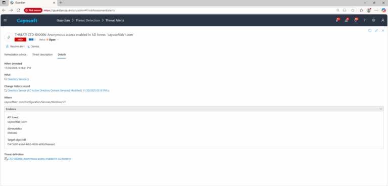 Cayosoft Guardian can proactively detect and alert on Anonymous access enabled in AD forest. It continuously monitors Active Directory, Entra ID, Microsoft 365, and Intune for over 200 misconfigurations, providing early warning before attackers can exploit them.