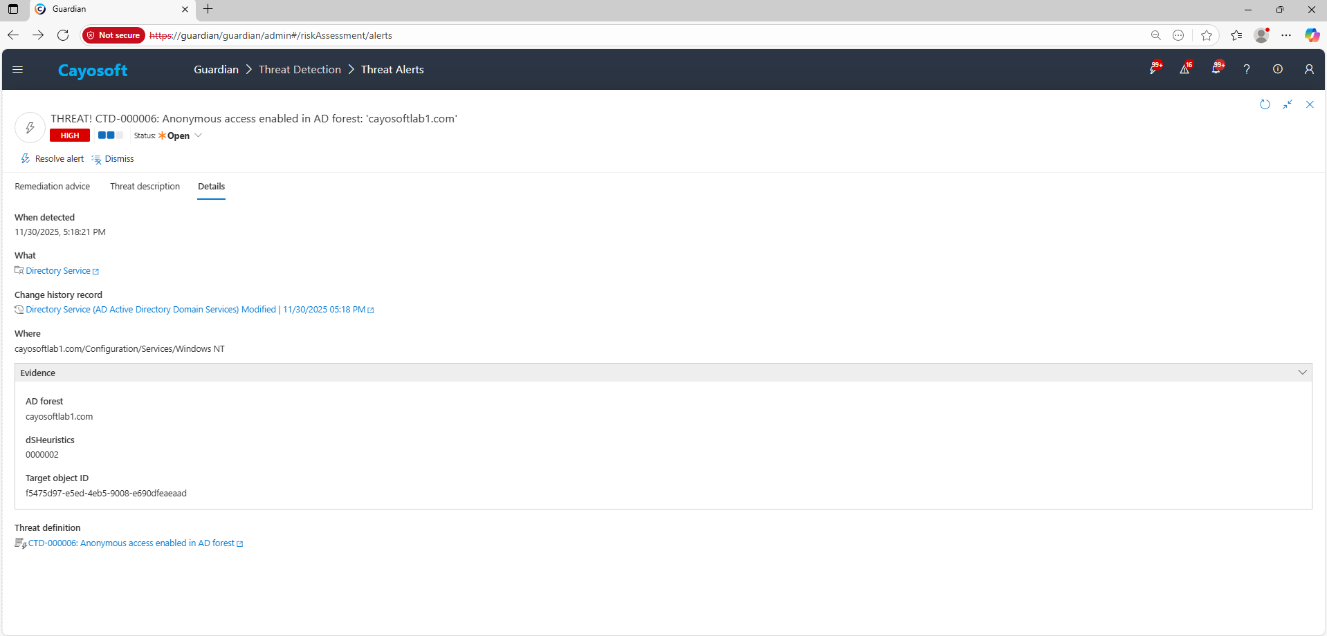 2.) Open All Alerts and search for CTD-000006 or Anonymous access enabled in AD forest.