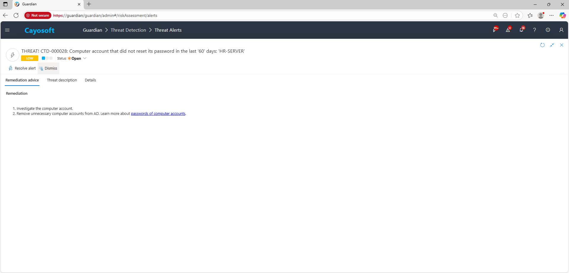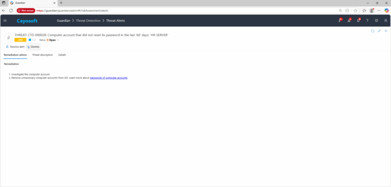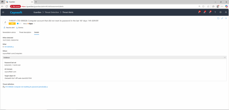 Cayosoft Guardian continuously monitors Active Directory for stale machine credentials, flags computer accounts that aren’t rotating their passwords, provides evidence such as pwdLastSet and object identifiers, and delivers prescriptive remediation guidance for rapid correction.