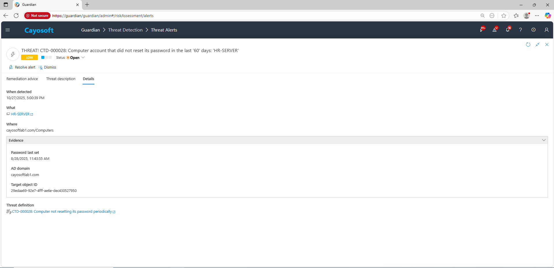 In the Cayosoft Guardian Threat Detection Dashboard, search for CTD-000028 or the issue name. The alert lists computers where the pwdLastSet attribute exceeds the policy threshold (typically 60 days), along with each object’s domain and ID. This helps identify systems that are no longer updating their machine passwords automatically.