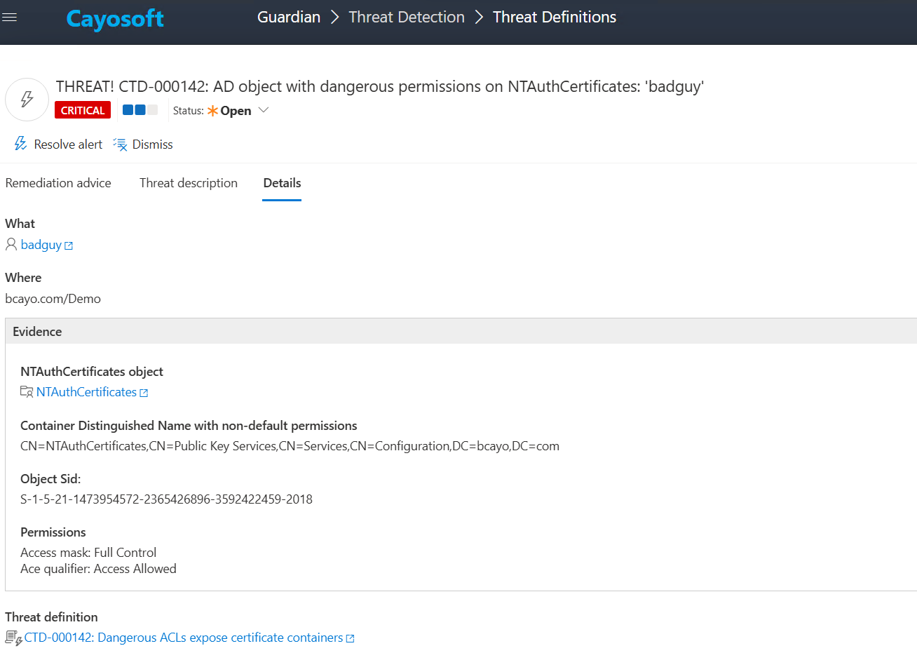 Cayosoft Guardian provides early detection, detailed evidence of misconfigured permissions, and guided remediation to prevent attackers from abusing certificate trust relationships.