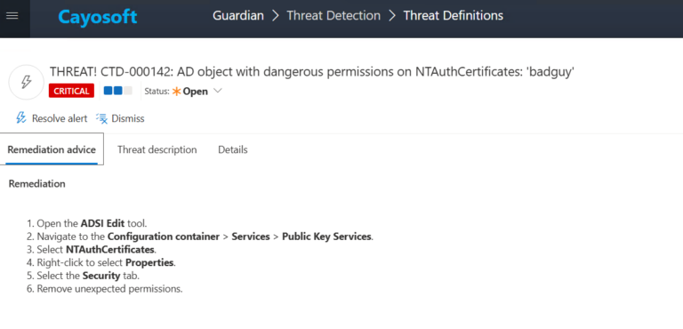 Cayosoft Guardian can proactively detect and alert on Dangerous ACLs expose certificate containers. It continuously monitors Active Directory, Entra ID, Microsoft 365, and Intune for over 200 misconfigurations, providing early warning before attackers can exploit them.