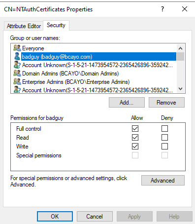 Non-default principals with elevated permissions on the NTAuthCertificates container pose a severe security risk. Improper Access Control Lists (ACLs) can allow attackers to insert a rogue CA, enabling the issuance of fraudulent certificates trusted by the domain. This undermines authentication integrity, facilitates credential theft, and can lead to full domain compromise.