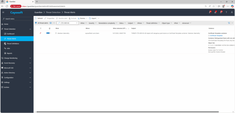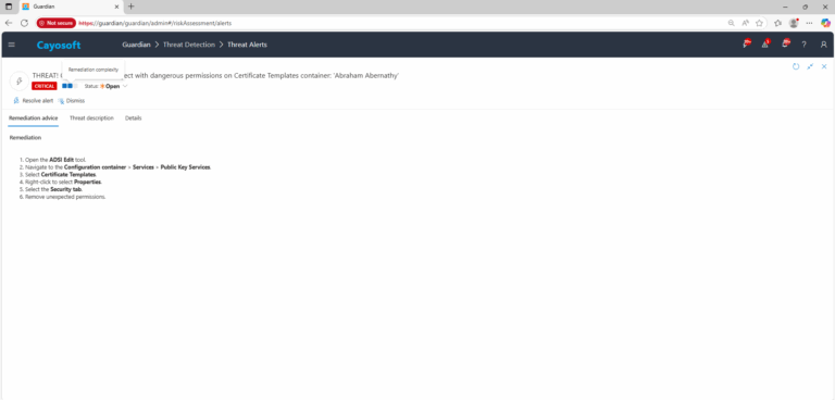 Cayosoft Guardian can proactively detect and alert on Dangerous ACLs expose Certificate Templates container. It continuously monitors Active Directory, Entra ID, Microsoft 365, and Intune for over 200 misconfigurations, providing early warning before attackers can exploit them.