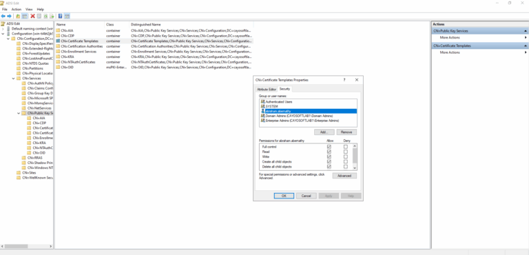 The Certificate Templates container defines templates for issuing certificates across the domain. Misconfigured Access Control Lists (ACLs) allowing non-default principals elevated permissions can be exploited to create or alter templates that issue certificates for domain admins or other privileged accounts. These rogue certificates bypass normal authentication controls and can be used to impersonate high-value targets or gain long-term persistence.