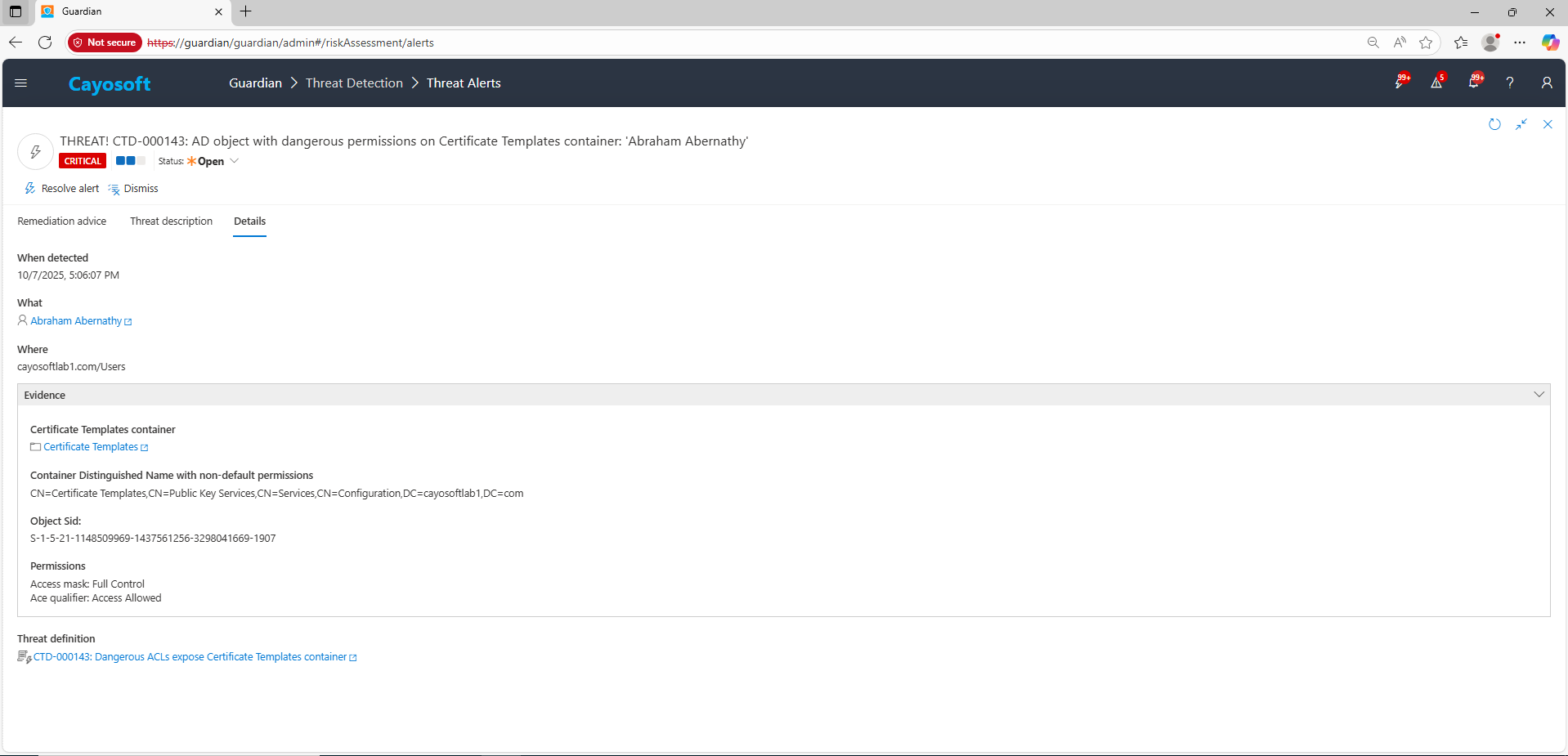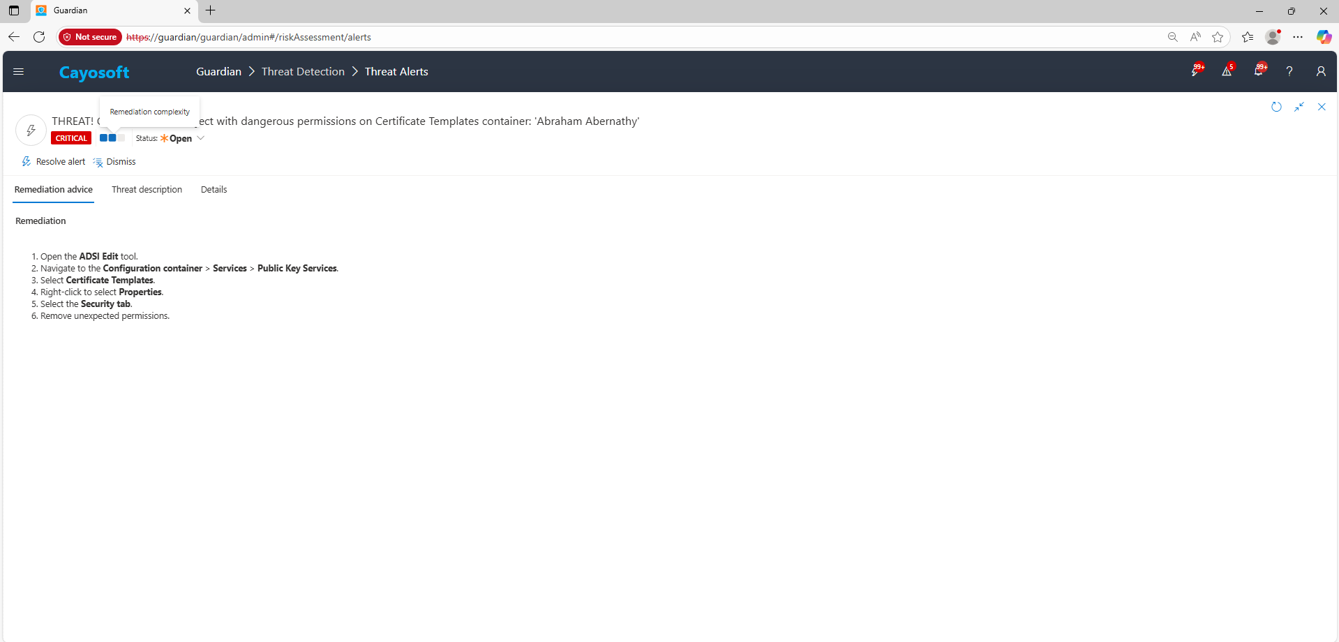Cayosoft Guardian can proactively detect and alert on Dangerous ACLs expose Certificate Templates container. It continuously monitors Active Directory, Entra ID, Microsoft 365, and Intune for over 200 misconfigurations, providing early warning before attackers can exploit them.