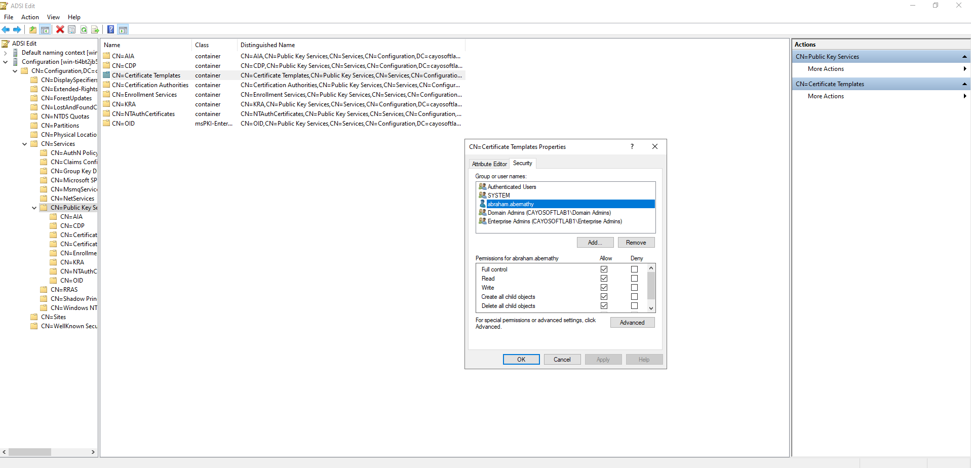 The Certificate Templates container defines templates for issuing certificates across the domain. Misconfigured Access Control Lists (ACLs) allowing non-default principals elevated permissions can be exploited to create or alter templates that issue certificates for domain admins or other privileged accounts. These rogue certificates bypass normal authentication controls and can be used to impersonate high-value targets or gain long-term persistence.