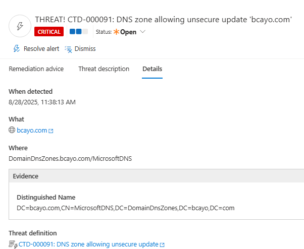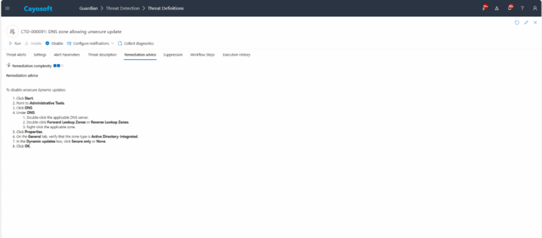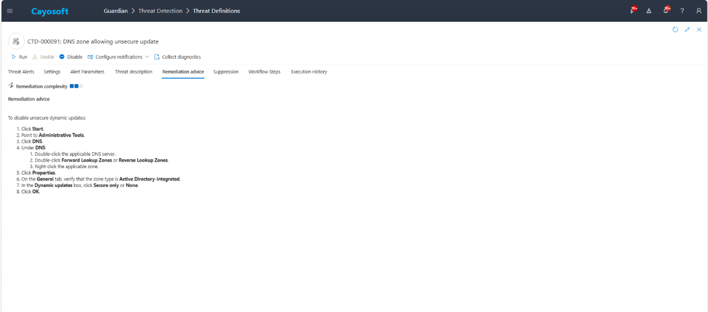 Cayosoft Guardian can proactively detect and alert on DNS zones allowing unsecure updates. It continuously monitors Active Directory, Entra ID, Microsoft 365, and Intune for over 200 misconfigurations, providing early warning before attackers can exploit them.