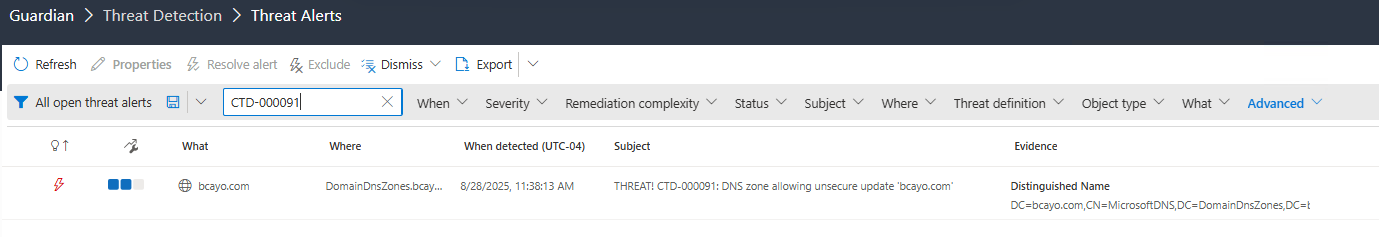 2.) View All Alerts and search for CTD-000091 or DNS zone allowing unsecure update