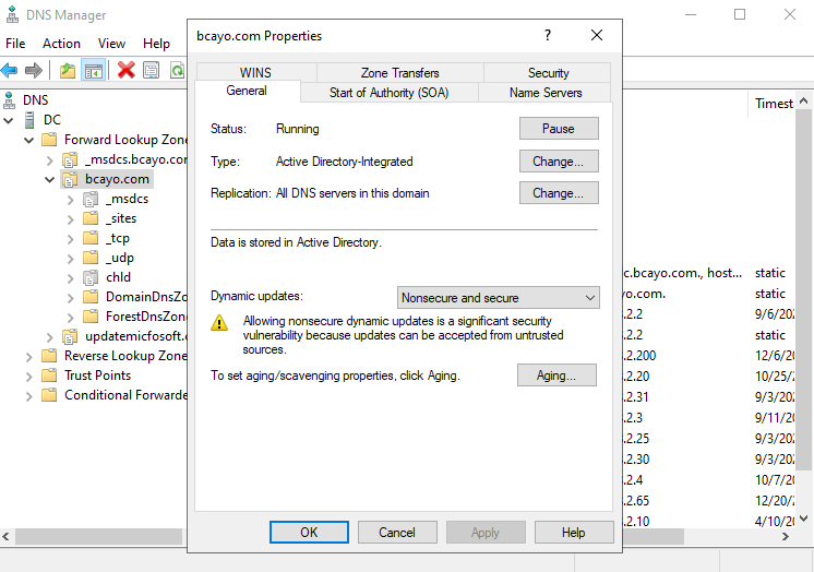 A DNS zone for corp.local is configured for unsecure dynamic updates.