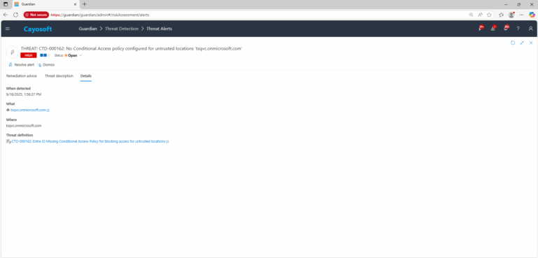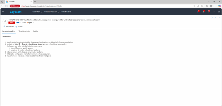 Cayosoft Guardian can proactively detect and alert on missing Conditional Access policies for untrusted locations. It continuously monitors Active Directory, Entra ID, Microsoft 365, and Intune for over 200 misconfigurations, providing early warning before attackers can exploit them.